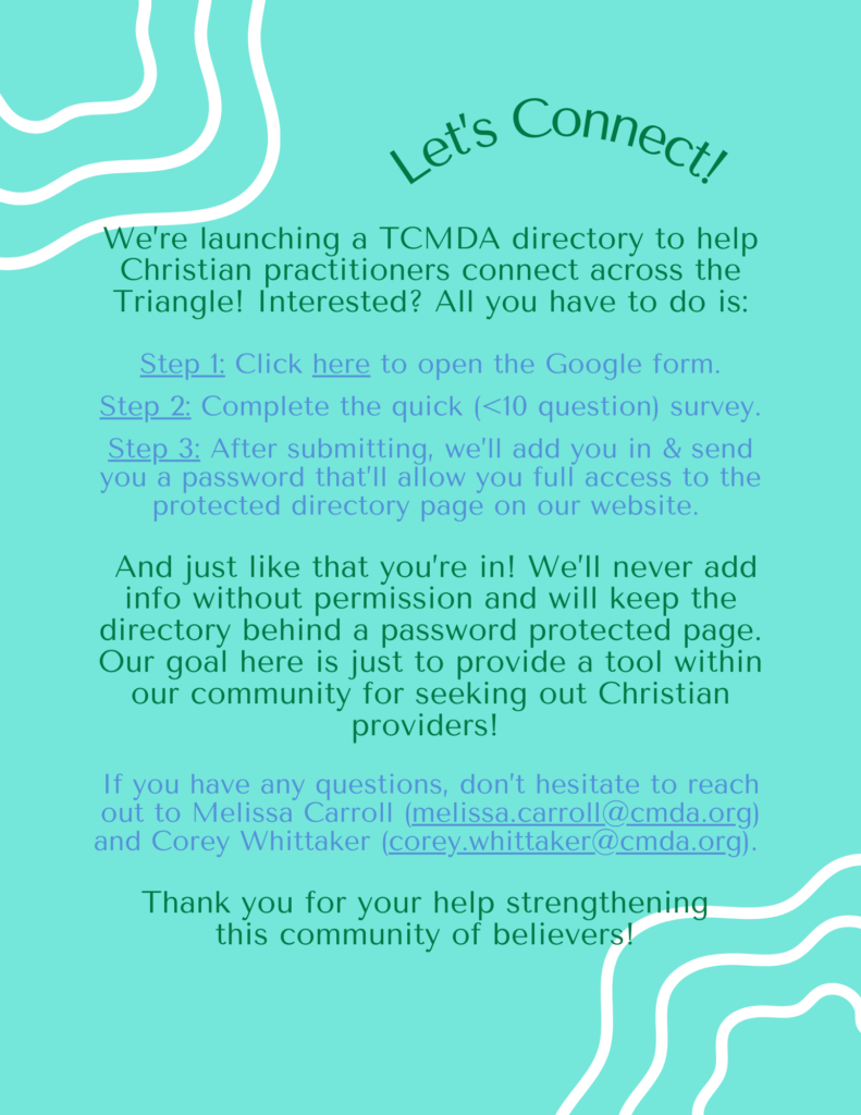 The Triangle Christian Medical and Dental Associations is the central North Carolina Ministry of CMDA (WWW.CMDA.ORG). We work with healthcare students at Duke, UNC and Campbell and with practitioners all over the Triangle. We are drawing together Christians in the academy and the clinics, providing discipleship, fellowship and pastoral support. If you would like to know more, email our Area Director at corey.whittaker@cmda.org
